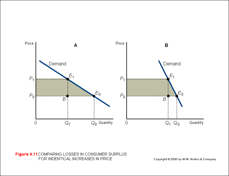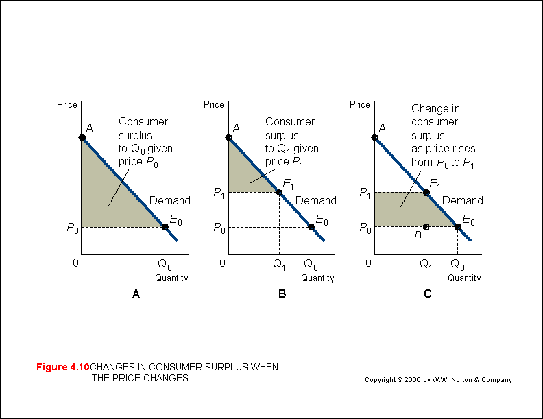Accordingly, as price rises or falls the consumer surplus changes (M&Y 10th Fig. 4.10; M&Y 11th Fig. 3.13; B&Z Fig. 4.10; B&B Fig 5.15).  Similarly, the size of the consumer surplus will vary according to the shape of the demand curve - the gentler the slope, the greater the consumer surplus (M&Y 10th Fig. 4.11; M&Y 11th Fig. 3.15; B&Z not displayed; B&B not displayed).