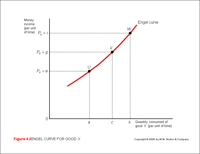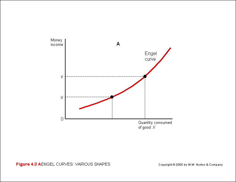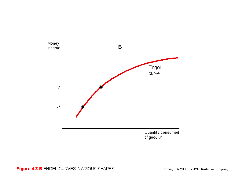 The amount of a commodity (x) purchased at different levels of income can be derived from the income-consumption curve (M&Y 10th Fig. 4.2; M&Y 11th Fig. 3.2; B&Z Fig. 3.14) to form  Engel curve (M&Y Fig. 4.2, p. 92; B&Z not displayed; B&B Fig. 5.3).  The Engel curve plots changes in the level of X consumed (x-axis) against changes in money income (I on the y-axis).  The shape of an Engel curve depends on the type of commodity and consumer taste - assuming constant prices.  The quantity of a commodity (x) purchased will increase at either an increasing or decreasing rate as income rises - depending on the type of commodity (M&Y 10th Fig 4.3a & 4.3b; M&Y 11th Fig. 3.4a & 3.4b; B&Z not displayed; B&B Fig. 5.4).  The Engel curve can be useful in marketing research as it will indicate the path of demand for a given commodity as income increases (or decreases).
