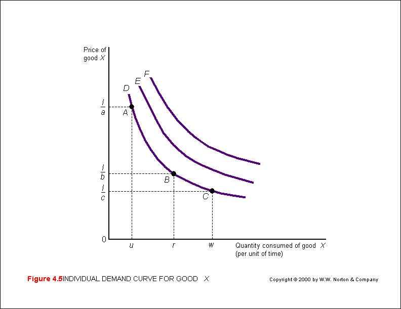 The demand curve for a given commodity (x) can be derived from the price-consumption curve showing how much of that commodity (x) is purchased at different prices - assuming constant income and constant prices for the other good (y) (M&Y 10th Fig. 4.5; M&Y 11th Fig. 3.7; B&Z Fig. 4.1; B&B Fig. 5.1). The shape of the demand curve (x) depends on taste, income and the type of commodity - assuming constant prices for the other good (y).  Note that the demand curve is plotted with the quantity of x on the x-axis and Px on the y-axis.  For normal goods the demand curve is downward sloping from the left reflecting the basic Law of Demand: the lower the price, the greater the demand.