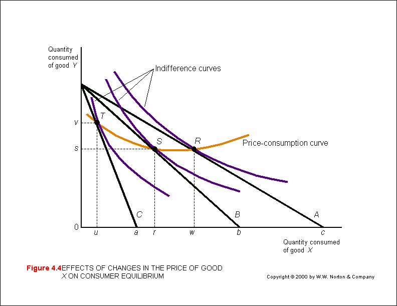 If the price of one commodity (x) changes a new set of combinations (x, y) is created between the changing tangents of the budget line and indifference curves forming  a price-consumption curve for the commodity (x) - assuming constant income and prices of the other commodity (y) (M&Y10th  Fig. 4.4; M&Y 11th Fig. 3.6; B&Z Fig. 3.14; B&B Fig. 5.1).  The price-consumption curve shows how much of a commodity (x) is purchased if its price changes - assuming constant income and constant prices for the other good (y).