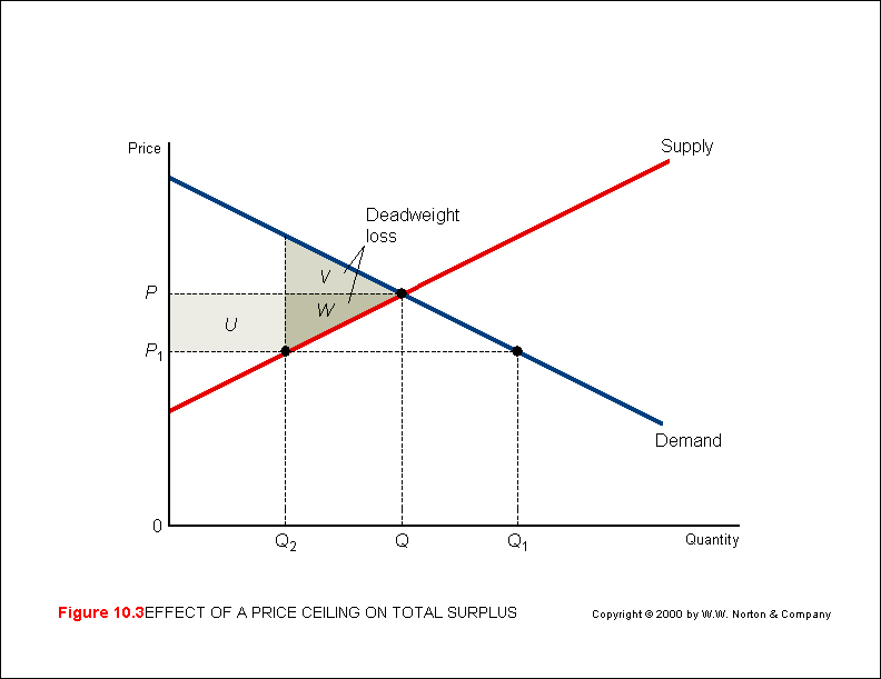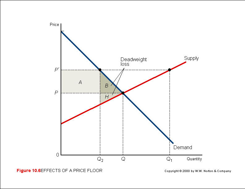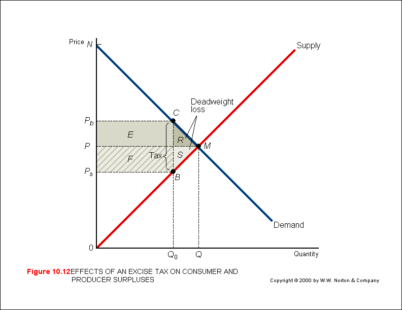 3.3 Equity From time to time the State chooses not to accept the outcome of even a perfectly competitive marketplace. Generally this reflects questions of equity - the 3rd 'e' of economics: efficiency, effectiveness and equity. The outcome is judged 'unfair' to some group or sector of society. In such cases Government can intervene in a number of ways. The effects of such intervention is to alter the balance of producer and/or consumer surplus reallocating one or the other to the other party. (Producer Surplus -M&Y 10th Fig. 10.1; M&Y 11th Fig. 9.1; B&B not displayed; B&Z not displayed: Total Surplus M&Y 10th Fig. 10.2; M&Y 11th Fig. 9.2; B&B Fig. 10.1) One technique is a price ceiling (M&Y 10th Fig. 10.3; M&Y 11th Fig. 9.3; B&B Fig. 10.10; B&Z not displayed). The effects of a price ceiling depend, however, on the elasticity of demand. If, for example, demand is inelastic the effect of the price ceiling may be to cost consumers - overall - more than they gain (M&Y 10th Fig. 10.4; M&Y 11th Fig. 9.4; not displayed B&B, B&Z). Fig. 10.5 - Rent Control, p. 309 Fig. 10.6 - Price Floor Fig. 10.7 - Price Support Fig. 10.8 - Imports, p. 313 Fig. 10.9 - Tariff or Quota, p. 314 Fig. 10.10 - Excise Tax, p. 318 Fig. 10.12 - Excise Tax & Surplus, p. 321