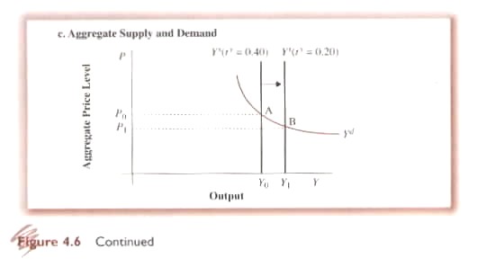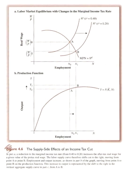 To assess the differential impact of tax policy we shift from tax increases to reductions. We will consider both the demand- and supply-side effects of such a tax reduction. Demand-Side On the demand-side a decrease in taxes would increase disposable income thereby increasing consumption. If the tax cut was matched by a reduction in government spending to keep the budget in balance then there would be no further effect. The Classical Equilibrium would be maintained. If, however, the tax cut was not matched by a decline in government spending then a deficit would result requiring government to pay either by borrowing or increasing the money supply. If it borrowed then it would crowd out private investment by raising interest rates and the findings in (a) above would hold. If instead government financed the deficit by increasing the money supply then the results in (b) above would hold. Supply-Side The demand-side analysis essentially assumed that the tax reduction was a ‘lump sum’ decrease, e.g. every tax payer had his or her taxes reduced by $500. However, a tax reduction could take the form of a decrease in the ‘marginal income tax rate’. In this case the more you earned the more you would keep as disposable income. In effect this would amount to an increase in the ‘real’ wage. An increase in the ‘real’ wage (an increase not paid by firms) would increase the willingness of workers to work shifting the supply of labour (Fig. 4.6a, p. 75). In effect this reduces the real wage paid by firms causing them to increase output (Fig. 4.6b, p. 75) and equilibrium employment moves from N0 to N1 and equilibrium output (Fig. 4.6c, p. 76) from y0 to y1.