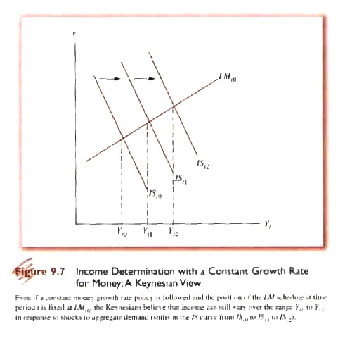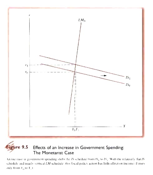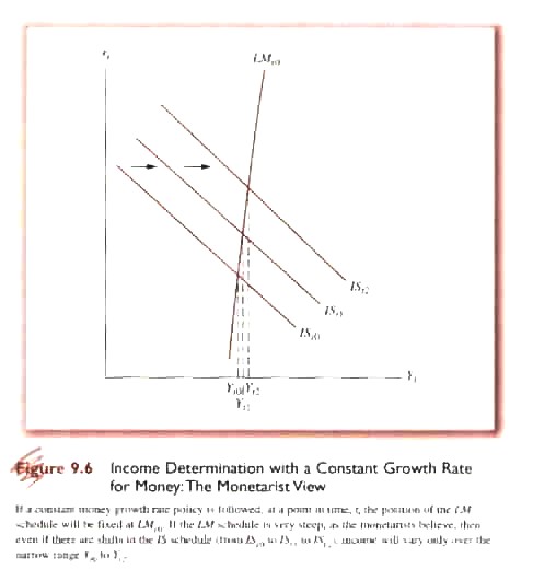 The policy implications of the Monetarist Model for fiscal and monetary policy are quite different from the Keynesian Model. i – Fiscal Policy Assuming government increases G without raising T, it must finance the resulting deficit either by printing money or borrowing on financial markets (Fig. 9.5). An increase in G shifts the IS curve up to the right. Accepting the Monetarist position regarding the slope of the IS and LM curves then the shift in IS results in a relatively significant increase in the interest rate (r0 to r1) with a very slight increase in Y (Y0 to Y1). In effect increase government borrowing raises the interest rate causing private investment to decline (crowding out) thereby minimizing the impact on Y of increased G. This can be contrasted with the Keynesian Model shown in Fig. 9.1. ii – Monetary Policy To the Monetarist instability in Y resulted, not as in the Keynesian Model from instability of private investment, but rather from instability in the growth of the money supply. Accordingly the best thing that the monetary authorities can do is to increase the money supply at a relatively steady rate, i.e., by a rule rather than at the discretion of policymakers. Accepting the Monetarist assumptions about LM and IS, changes in the IS curve, e.g., increases in G or X, will have limited effect on Y but significant effects on r and P. A stable increase in the money supply will mitigate inflationary pressure without introducing additional instability (Fig. 9.6). Increases in the money supply also need to be stable because of imperfect knowledge about aggregate changes in the economy. Thus given current theory and information it is not possible to accurately predict the future state of the economy and using discretionary monetary policy to significantly affect aggregate demand would introduce further instability into the system. Thus the Monetarist position amounts to an effort to stabilize the economy rather than affect its growth. The long and short of it is that the Monetarist Model calls for limited changes in fiscal policy because it only crowds out private investment and a steady rate of increase in the money supply to stabilize rather than manipulate economic growth. The contrast with the Keynesian position is evident in Fig. 9.7. In other words, like the Classical Model, the Monetarist Model calls for minimum government intervention in the economy.