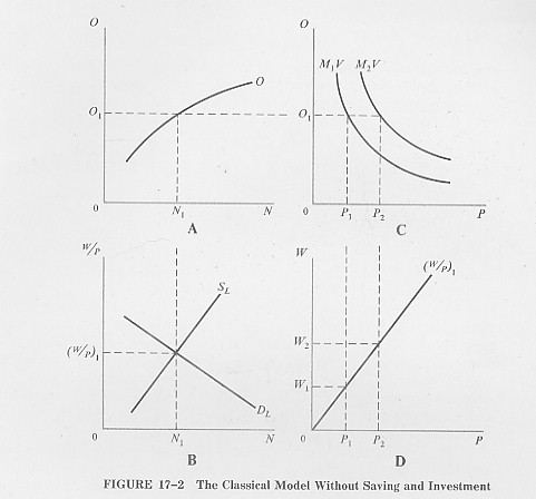Classical theory relied on Say’s Law to assure that aggregate demand would always be equal to aggregate supply; any increase in output automatically created an equal increase in spending that removed the increase in output from the market.  Classical theory relied primarily on a flexible money wage to assure that the actual level of output at any time would be that produced by a fully employed labor force.  Full employment, we remember, calls for a real wage that equates the supply of with the demand for labor; for any given price level, a flexible wage will adjust as required to produce the required real wage.  All this leaves the price level unspecified, and to cover this classical theory relied on the quantity theory of money.