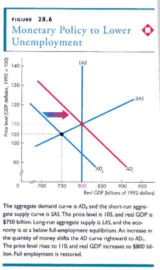 Before considering monetary policy’s application in lowering unemployment or inflation respectively in a recessionary or inflationary gap it is important to note that a central bank may pursue one of two alternative ‘target’ strategies.  The first is a money supply target that remains fixed while the shifting demand for money curve increases or decreases interest rates.  Monetarist policy publicly promises to increase the money supply only to match real growth in the economy and thereby avoid price inflation.  What happens to investment is left to the market.