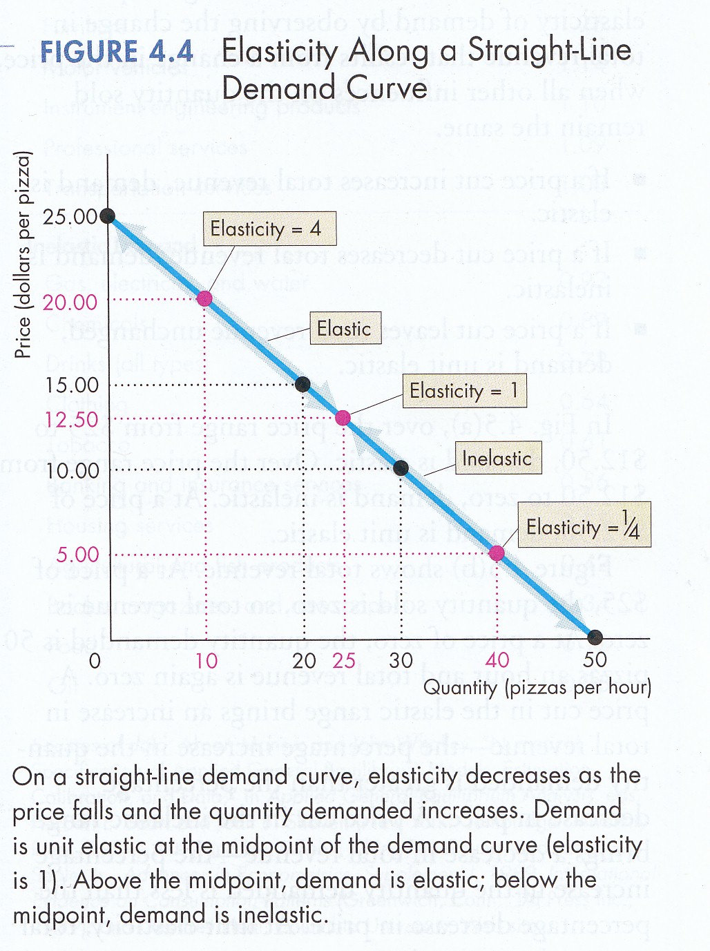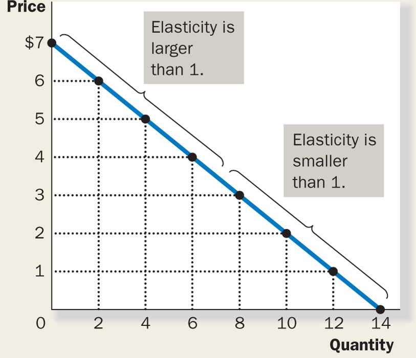 Elasticity is the sensitivity of one variable to a change in another variable.  Unlike the constant slope of a straight line is measured ΔY/ΔX or rise over run, Elasticity varies even along a straight line (P&B 7th Ed Fig. 4.4; R&L 13th Ed Fig. 4-2; MKM Fig. 5.4).  It is measured  (ΔY2-Y1/Y1)/(ΔX2-X1/X1) i.e., the change in Y divided by the change in X.  Economic theory recognizes three principal types of elasticity: