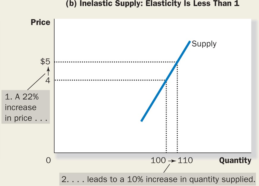 less than one (inelastic) - a near vertical demand or supply curve where a large change in price causes little change in demand or supply.