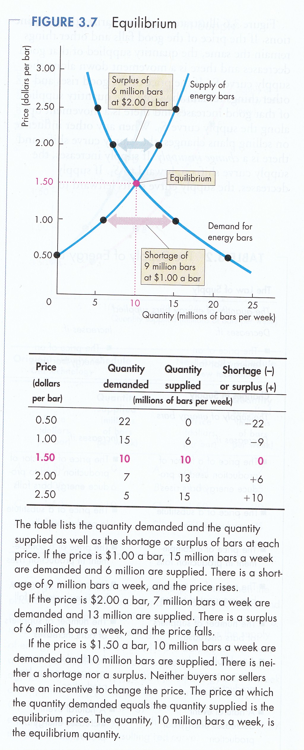 PB 7th Ed Fig. 3.7; MKM Fig. 4.8).  In the case of markets, the equilibrium price 'clears' the market, that is the quantity demanded by consumers equals the quantity supplied by producers.  More generally, economic theory recognizes four general types of equilibrium: